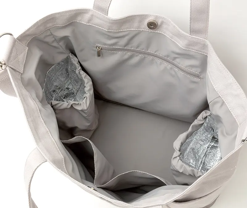 内側と外側合わせてポケットは9つ。たくさんの荷物も整理しやすく、おでかけ先でも欲しいものがサッと取り出せます。内側にあるドリンク用ポケット2つには、保冷機能のある生地を使用しています。