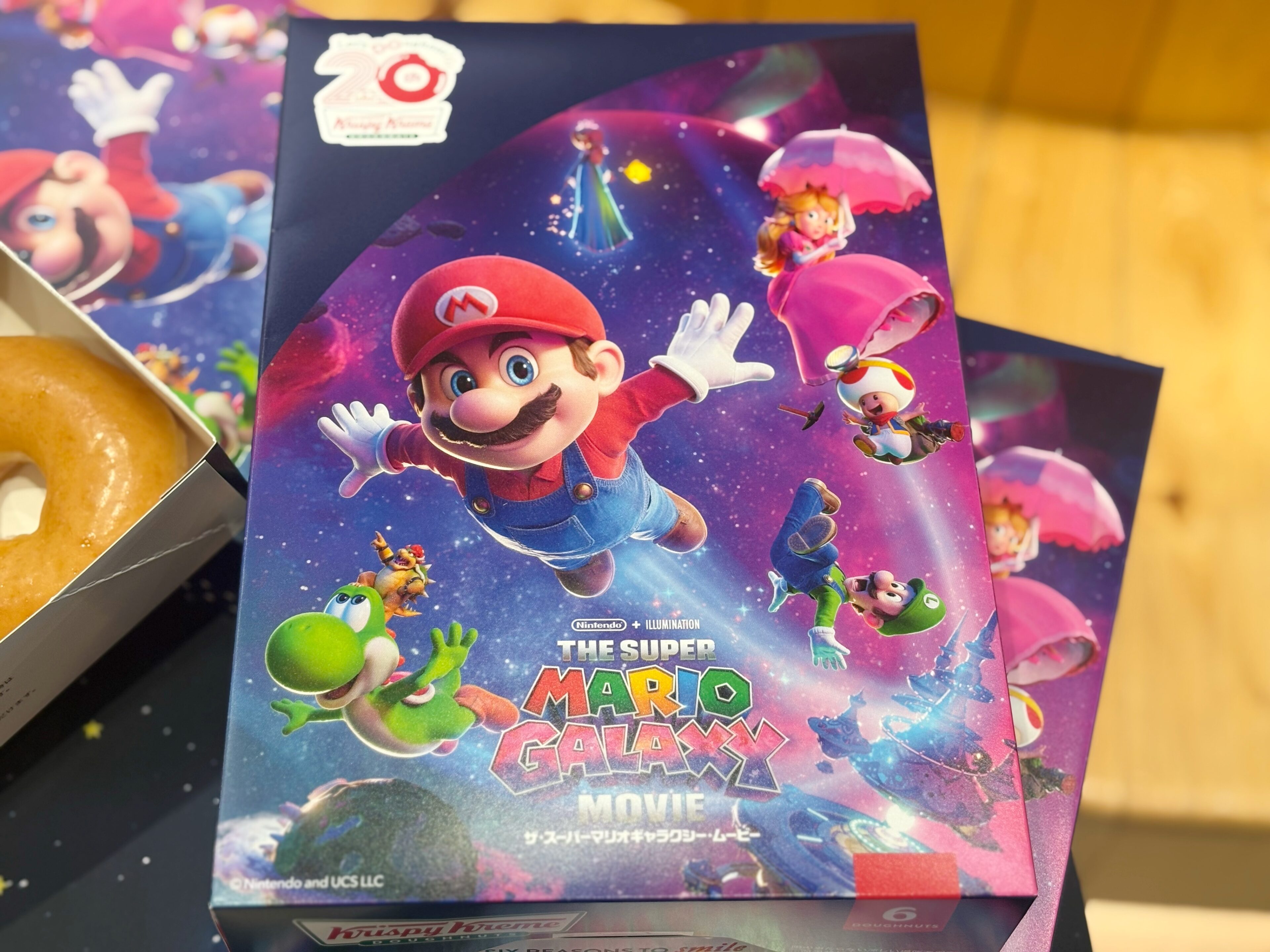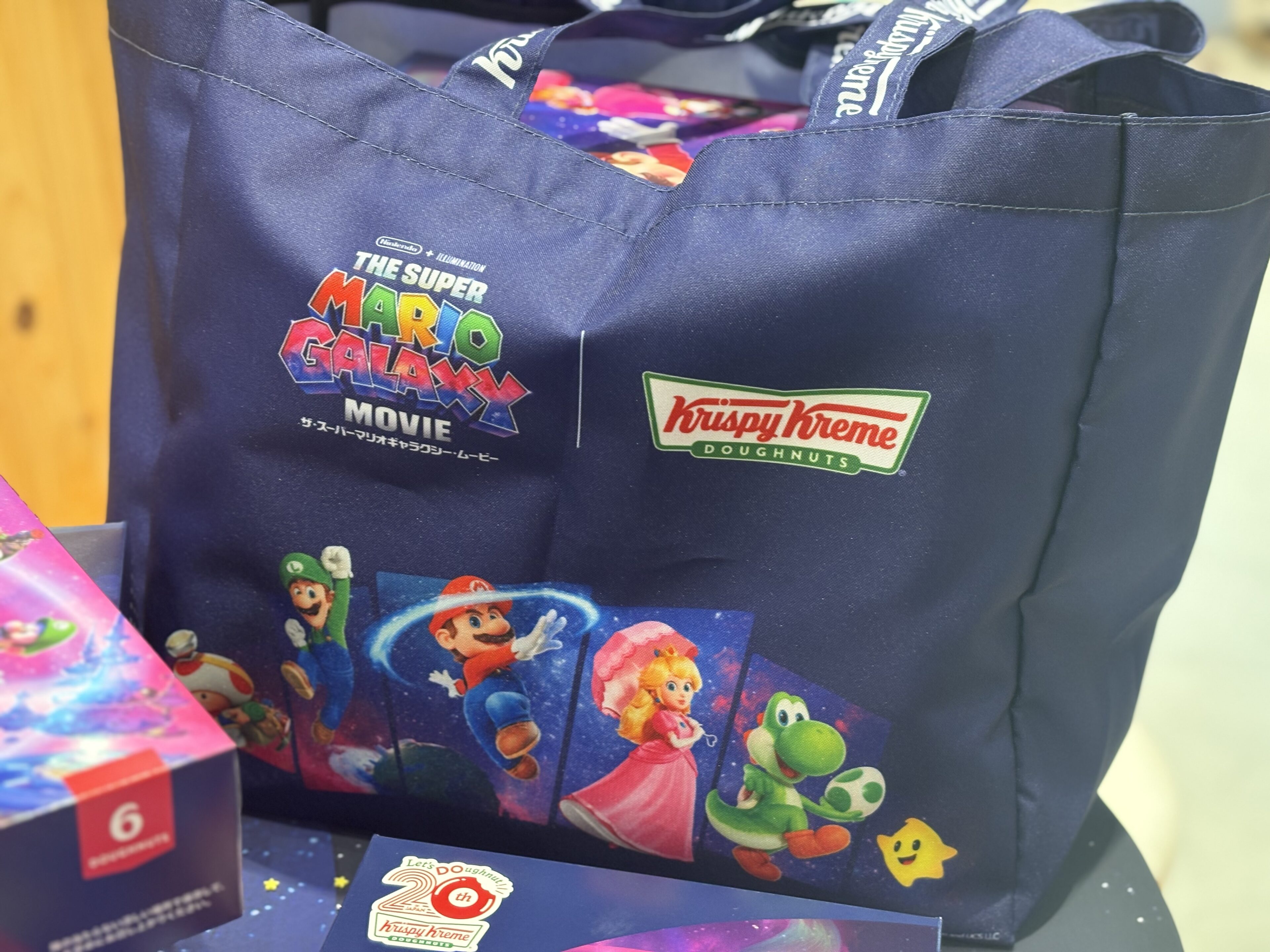 クリスピー・クリームのハーフボックス(ドーナツ6個用)が最大で4箱入る映画『ザ・スーパーマリオギャラクシー・ムービー』デザインの限定バッグもお見逃しなく!