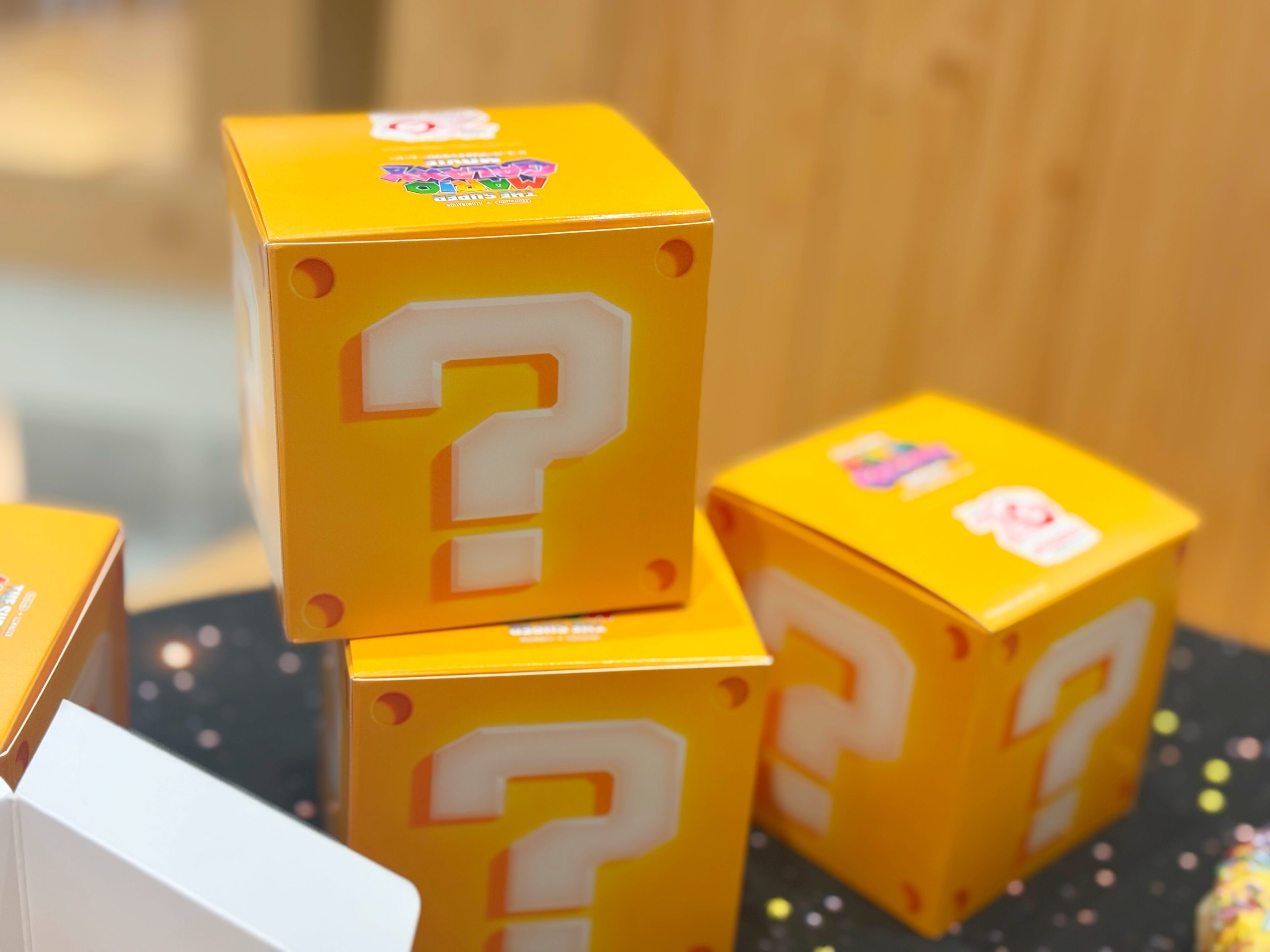 さらに、マリオの世界でおなじみの「ハテナブロック」を再現した特別なドーナツも登場。ボックスを開けるまでどのピックのアイテムが出るかわからない仕掛けで、まるでゲームのようなドキドキ感が楽しめます。