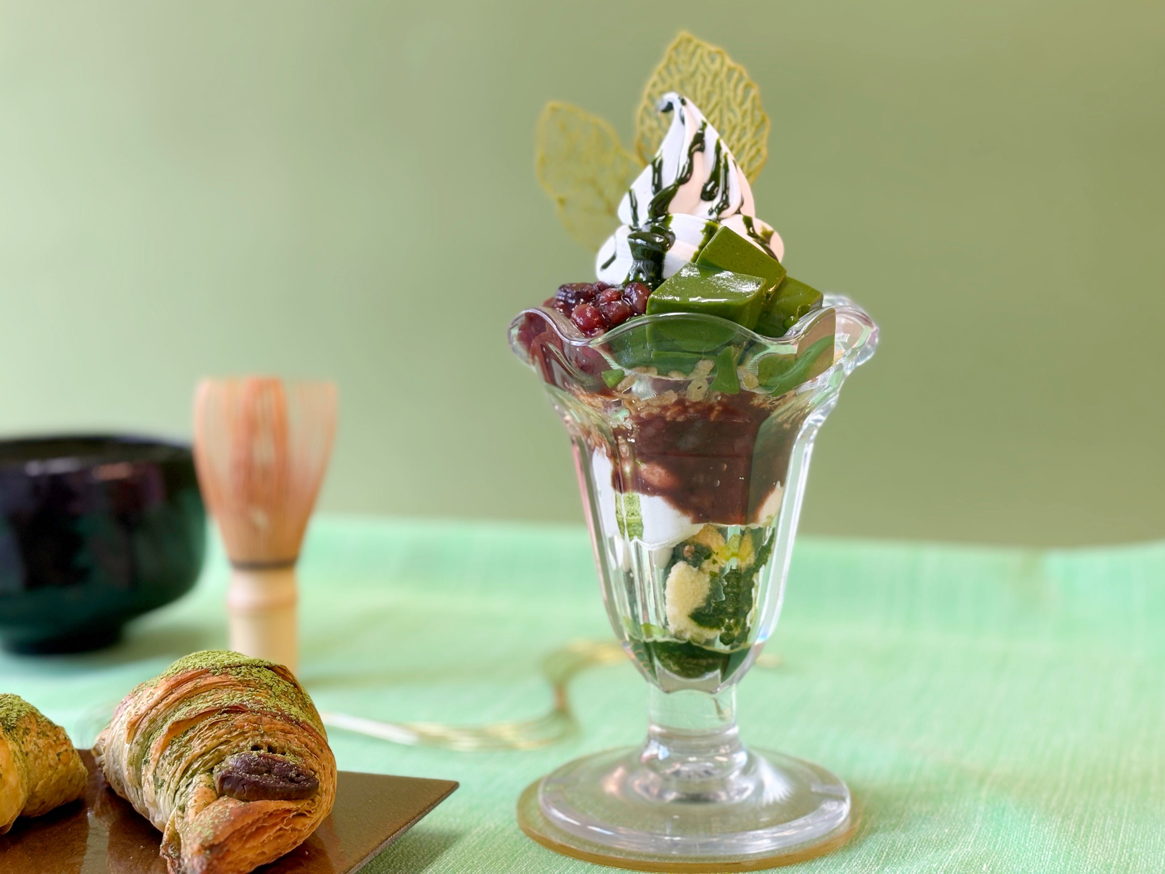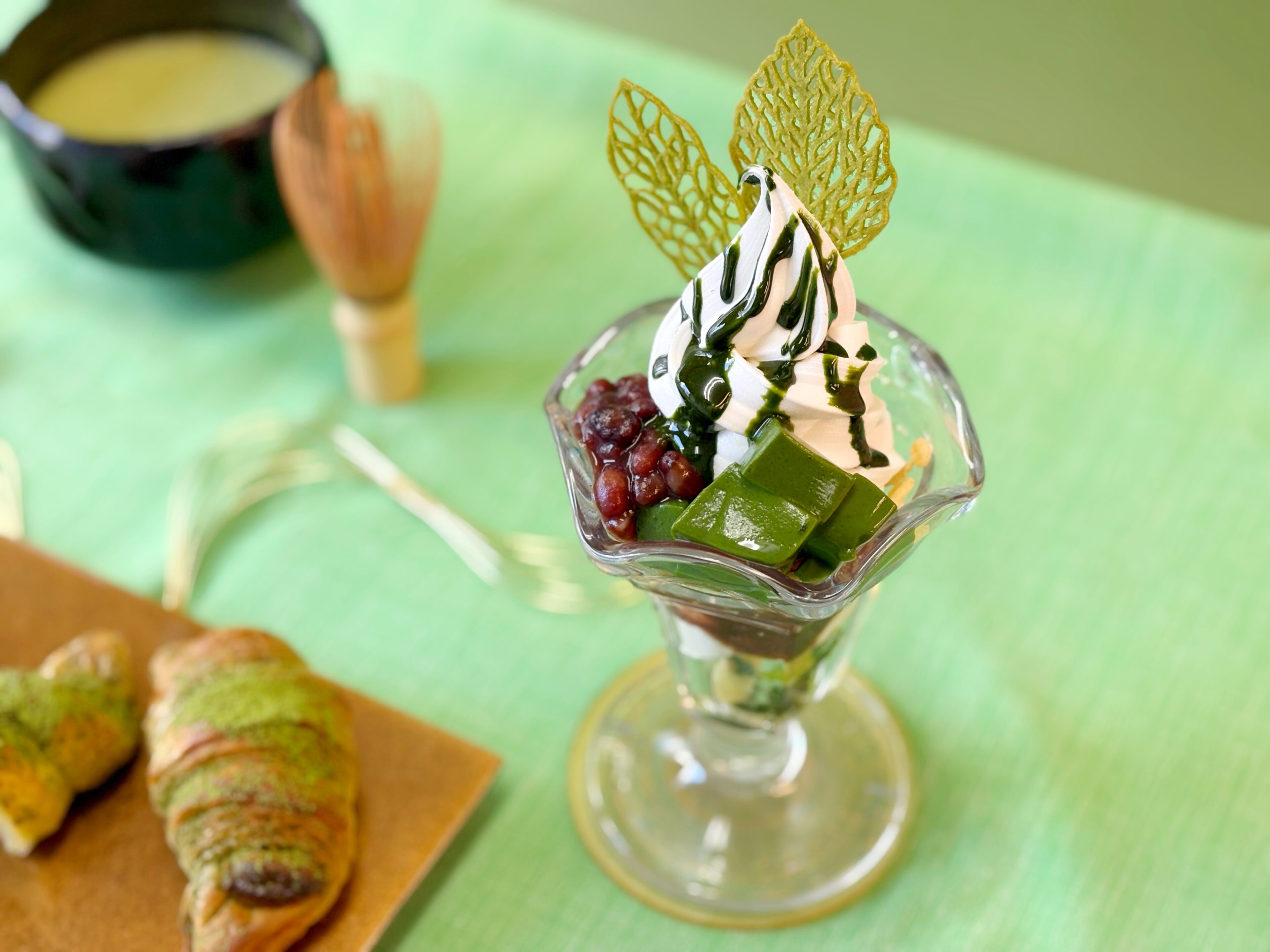 王道のチョコクロと、ご褒美感たっぷりのパフェ。どちらも祇園辻利の上質な抹茶をふんだんに使った、この季節だけの特別な味わいです。