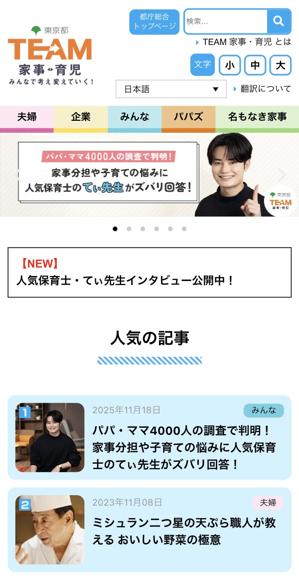 育児の息抜きに!東京都のWebサイト「TEAM家事・育児」なら人気保育士・てぃ先生や声優・梶裕貴さんの貴重なインタビュー記事が読める