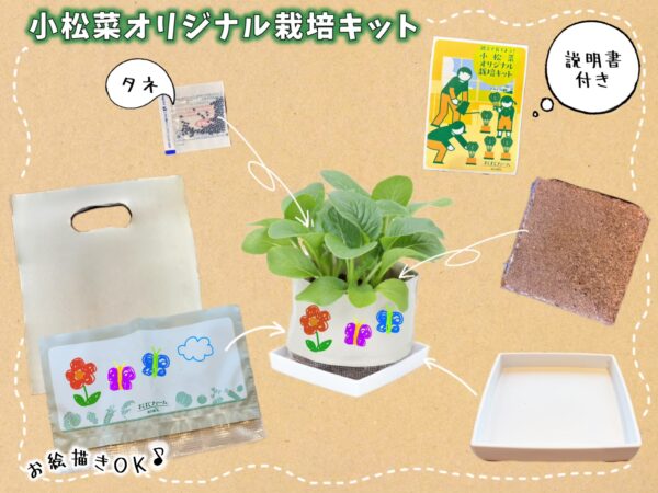 中区、西区、南区の3歳児健診を受診する親子を対象に、オリジナルの小松菜栽培キットをプレゼントする取組も実施されています。自宅で気軽に野菜作りを始められるこのキットには、栽培に必要なものが揃っていて、鉢にはお絵かきもできます。親子で育てる楽しさを体験してみませんか?
