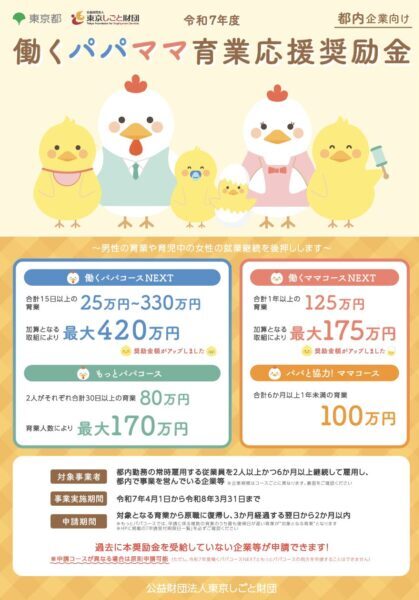 産業労働局の一番大きな事業としては「働くパパママ育業応援奨励金」です。このうち「働くパパコースNEXT」は男性が育業した場合に企業に対して奨励金を支給するもので、取得日数に応じて加算され、2025年度から最大420万円の支給としています。これをぜひ活用していただき、企業として男性の育業を促していただきたい、育業しやすい雰囲気を作っていただきたいですね。