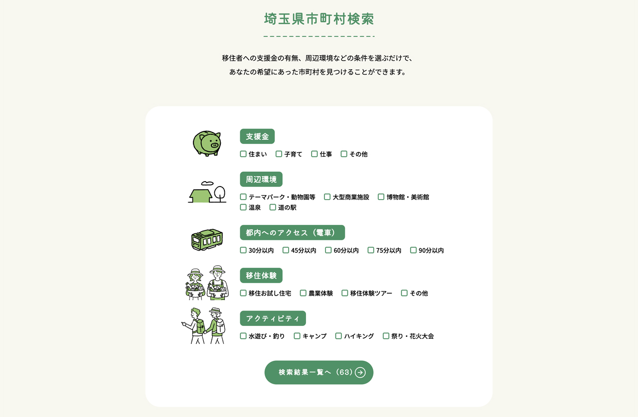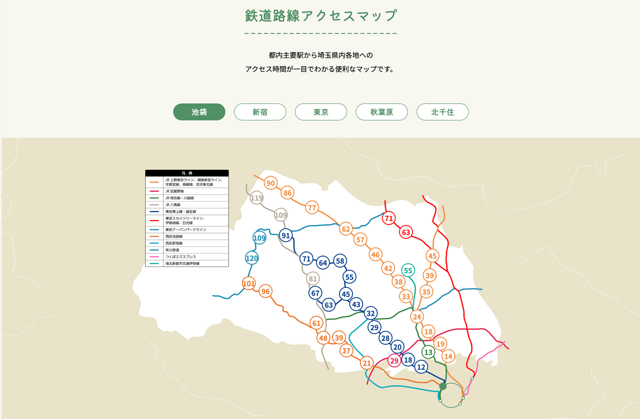 例えば「子育て支援制度がある」「都内まで60分以内」「移住お試し住宅がある」といった具体的な希望条件を入力することで、理想に近い市町村を効率的に見つけることができます。トップページの鉄道路線アクセスマップでは、池袋駅や東京駅など都内主要駅から埼玉県内各地への所要時間が一目で分かるため、通勤時間を考慮した住まい選びもスムーズ。