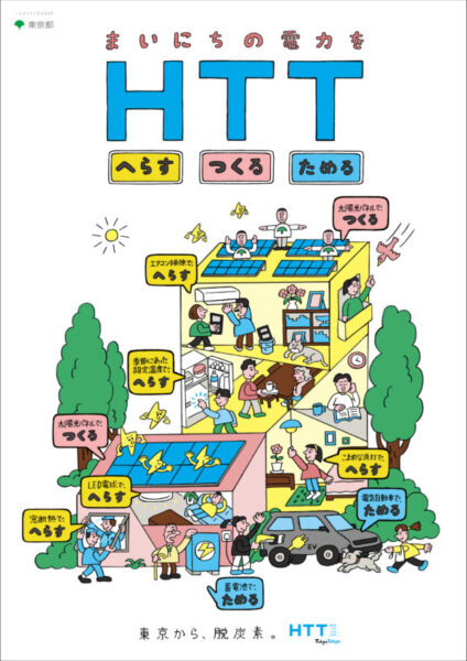 HTTとは、電力を「へらす(H)」「つくる(T)」「ためる(T)」の頭文字を取った造語で、東京都が推進している脱炭素社会の実現に向けた、都民の方々や事業者の方々への行動変容を促すためのキャンペーンです。