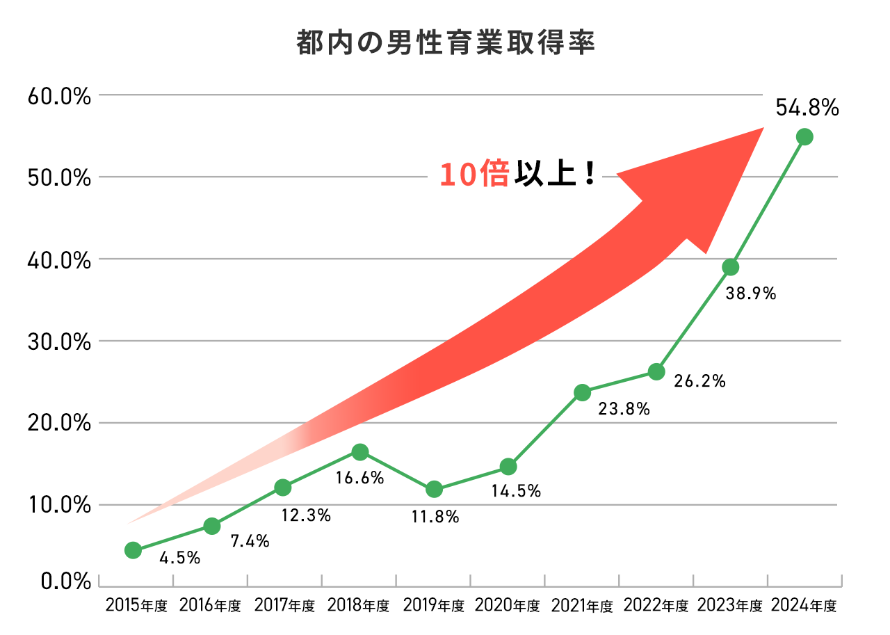“育業”とは、東京都が2022年に公募し、選定した育児休業の愛称です。東京都では、育児を「休み」ではなく「大切な仕事」と捉え、「育業」を社会全体で応援する気運の醸成に取り組んでいます。2024年度の都内男性育業取得率は、54.8%となり、いまや男性の2人に1人が育業しています。