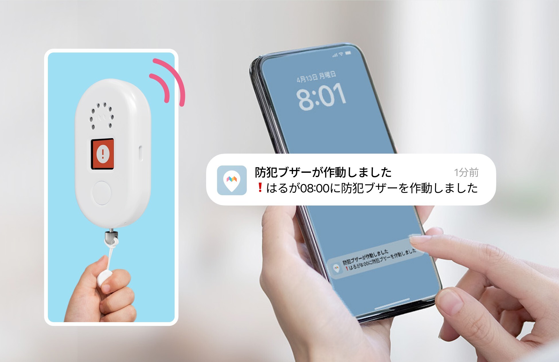 今までにありそうでなかった機能が防犯ブザーとの一体化。ブザーが作動すると、周囲に危険を知らせると同時に、保護者のスマートフォンへSOS通知と位置情報が即座に届くため、もし周りに誰もいなくても保護者が対応することが可能です。また、ブザー通知を受け取った保護者は、子どもの端末へ音声メッセージを送ることもできるので、子どもの不安も解消できるかもしれません。