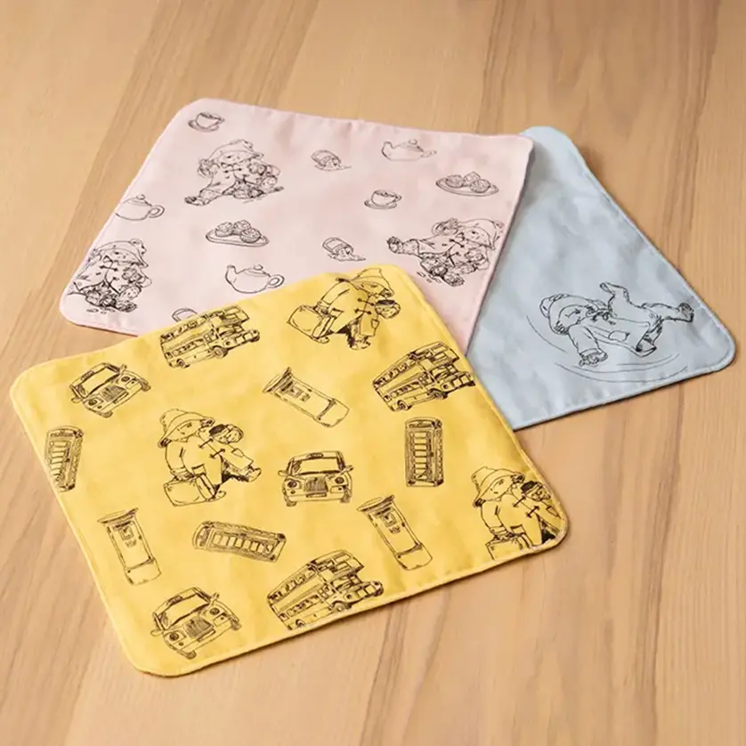 毎日どれにしようか選ぶ時間も楽しい3枚セット。見ためのかわいさはもちろん、素材にもこだわって作りました。表面には、丁寧に仕上げられた「紀州釜揉みガーゼ」を使用し、やわらかくやさしい肌ざわり。子どもの目元や口元を拭くときにもぴったり。裏面は、今治産のパイル生地で吸水性もしっかり。ループ付きなので園で使うのにも便利で、大人でも使いやすいサイズです。
